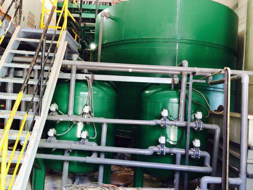 经混凝沉淀后的废水自流进入PH回调箱中,通过PH在线控制加以盐酸将废水PH控制在7.5~8之间;废水自PH回调箱自流进入氧化箱,在氧化箱中加入H2O2,进一步去除水中COD,以确保出水COD达标排放;废水经氧化箱后,经过滤泵进入砂碳过滤器,以达到再次去除水中悬浮物目的,确保废水出水悬浮物达标。